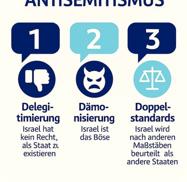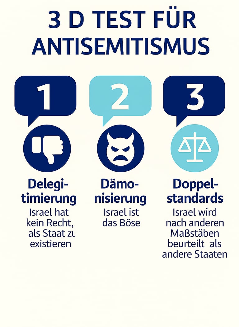 Ein einfacher Test, um Antisemitismus festzustellen ist der Drei D Test. Natan Scharanski, damals Minister Israels für soziale Fragen, entwarf den Test und stellte ihn im Februar 2003 erstmals öffentlich vor. Dieser Test ist einfach und gut zu merken. Und auch gut für eine erste Einschätzung. Wenn nur eines der Drei Ds zutrifft, dann ist das schon ein deutliches Zeichen für Antisemitismus und man sollte genauer prüfen.
