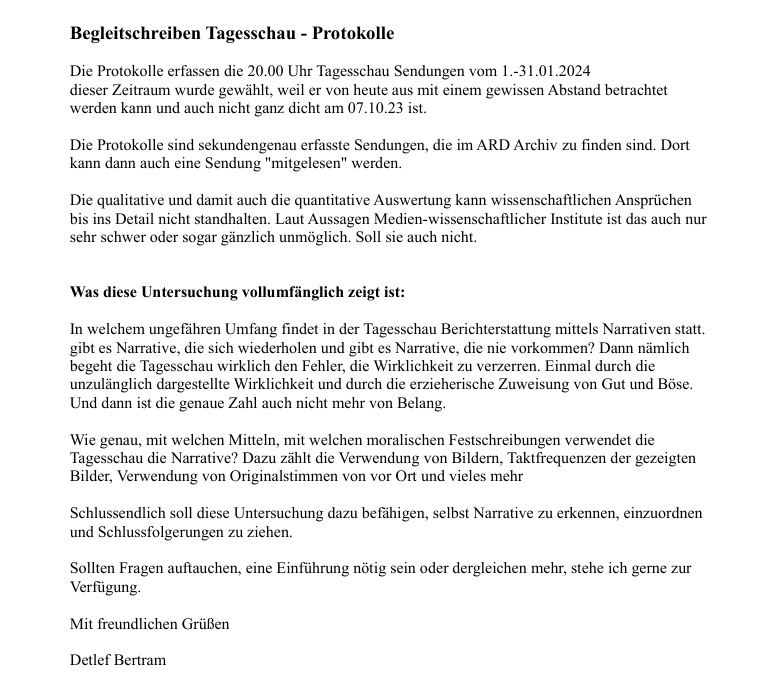 In dieser Programmbeschwerde wird zum einen beklagt, dass die Tagesschau fast ausschließlich mit Narrativen arbeitet und zum anderen als Narrativ fast ausschließlich das Narrativ der Hamas verbreitet.