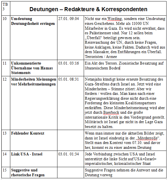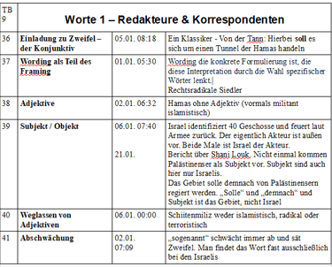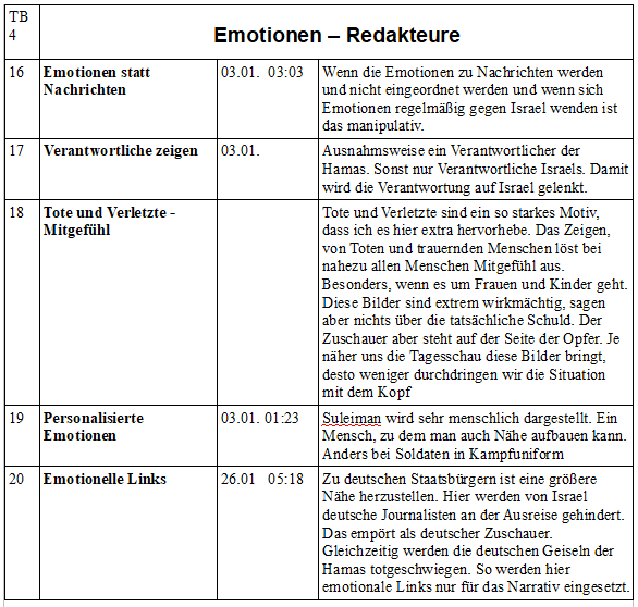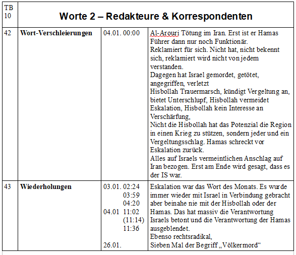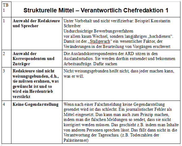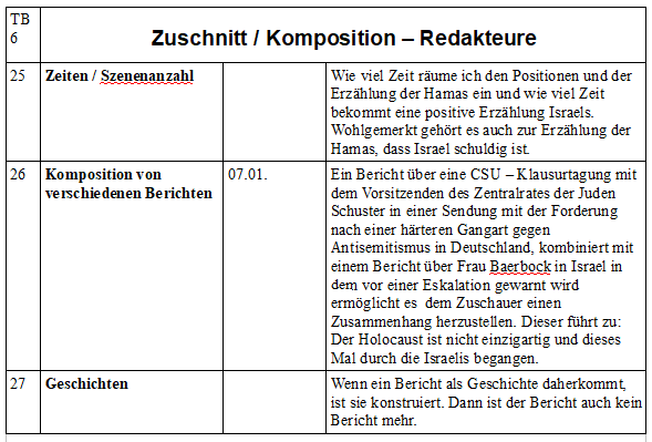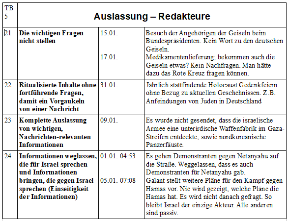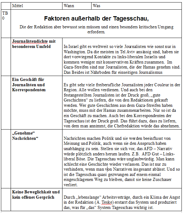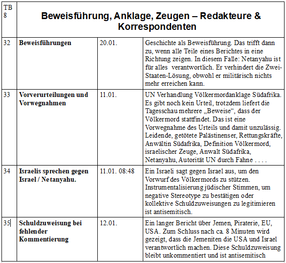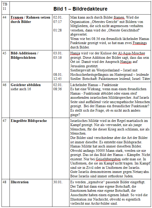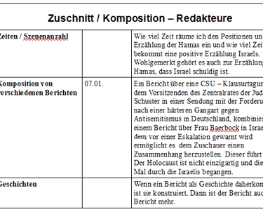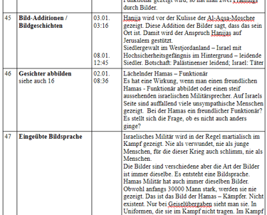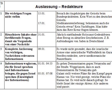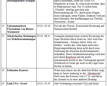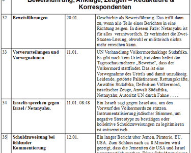 Hier sind 52 Mittel aufgelistet. Das ist das Ergebnis von einem Monat Tagesschau. Obwohl es sicherlich noch mehr zu finden ist, zeigt das doch, dass es nicht um einen Ausrutscher oder eine Text-Redaktion oder Teile der Redaktion geht. In allen Bereichen wird gegen Israel gearbeitet, so meine Einschätzung.