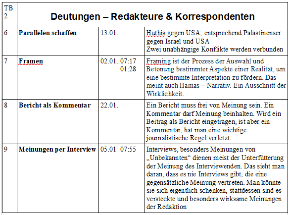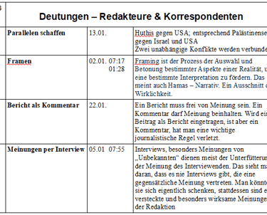 Das Dokument zeigt die journalistischen Mittel, die in der Tagesschau Januar 2024 identifiziert werden konnten. Es sind Mittel aus allen Bereichen der Redaktion. Chef- Bild, Textredaktion sind alle gleichermaßen beteiligt. Ein Mittel für sich ist meist zulässig und nicht von Übel. In dieser Ballung und einseitig eingesetzt, um Israel zu schaden, ist es unzulässig. In jedem Fall ist es unzulässig Kommentar und Nachricht zu mischen, was relativ oft geschieht.