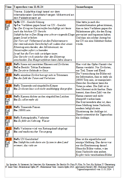 Bei jeder Sendung liefert die ARD quasi ein Inhaltsverzeichnis mit. Aus diesem "Inhaltsverzeichnis" entnehme ich das Thema, das ich dem Protokoll voranstelle. In diesem Fall: Südafrika klagt Israel vor dem Internationalen Gerichtshof wegen Völkermord an den Palästinensern an.