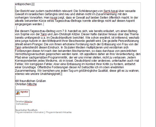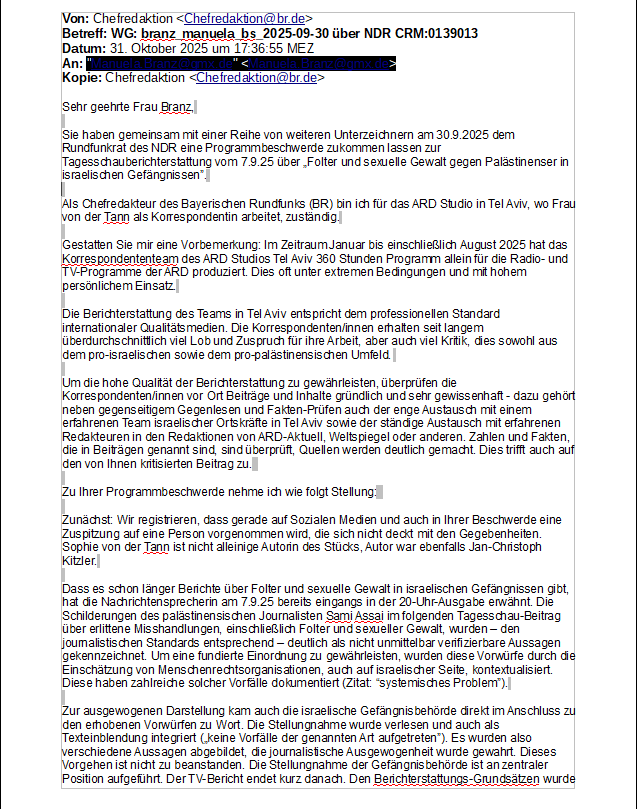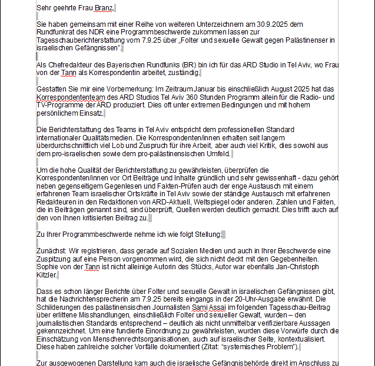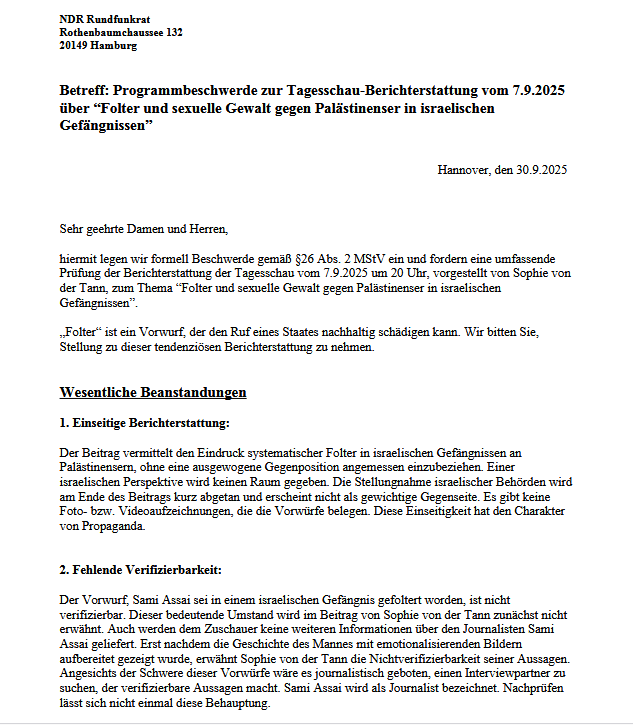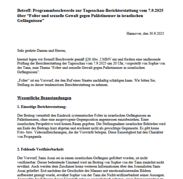 Betreff: Programmbeschwerde zur Tagesschau-Berichterstattung vom 7.9.2025 über “Folter und sexuelle Gewalt gegen Palästinenser in israelischen Gefängnissen”