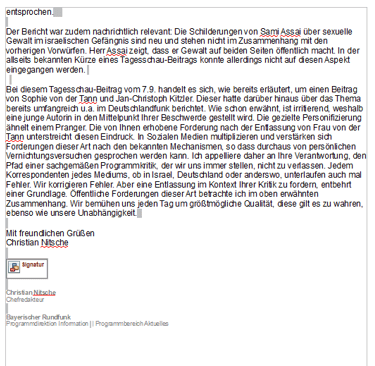 Die Ablehnung beinhaltet im wesentlichen, dass die Redaktion richtig und gut gearbeitet hat und dass die Absenderin nicht gut gearbeitet hat.