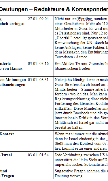 Hier sind 52 Mittel aufgelistet. Das ist das Ergebnis von einem Monat Tagesschau. Obwohl es sicherlich noch mehr zu finden ist, zeigt das doch, dass es nicht um einen Ausrutscher oder eine Text-Redaktion oder Teile der Redaktion geht. In allen Bereichen wird gegen Israel gearbeitet, so meine Einschätzung.